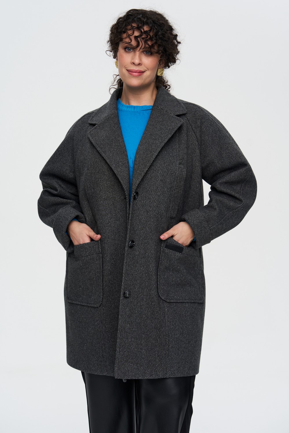Женское серое полупальто большого размера от бренда Интикома (Intikoma) с мягкой ворсистой структурой. Детали: прямой силуэт, с отложным воротником с лацканом, длинным рукавом реглан, с четырьмя карманами – нагрудными с листочкой, накладными карманами.