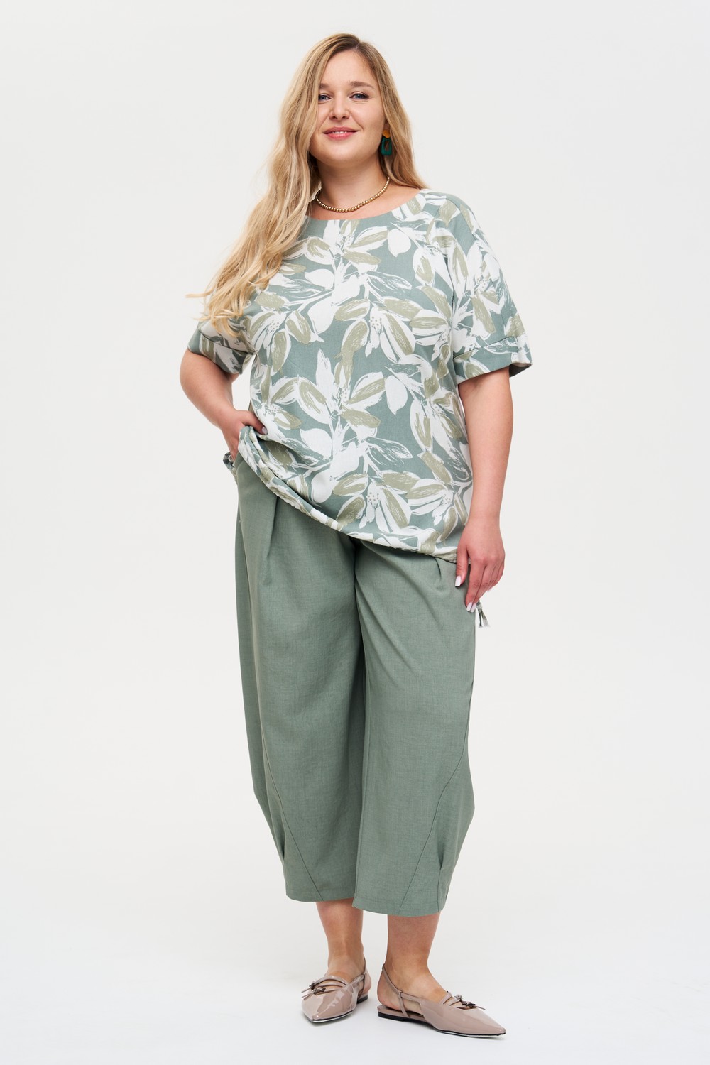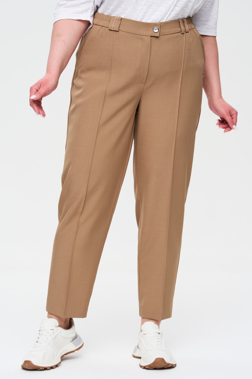 Женские бежевые брюки большого размера со стрелками из костбмной полувикозы от бренда Интикома (Intikoma). Декоративные, не функциональные карманы по переду. Застежка-гульфик на молнии. Пояс на молнию и пуговицу.