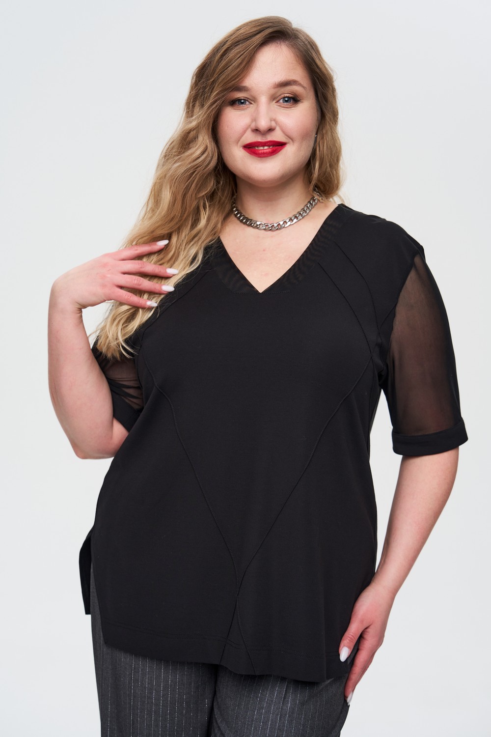 Описание: Женская черная блуза большого размера с короткими полупрозрачными рукавами из вискозы от бренда Интикома (Intikoma). Модель прямого кроя, со спущенной линией плеча, свободным рукавом из сетки на манжете, V-образной горловиной, декоративными защипами по переду.