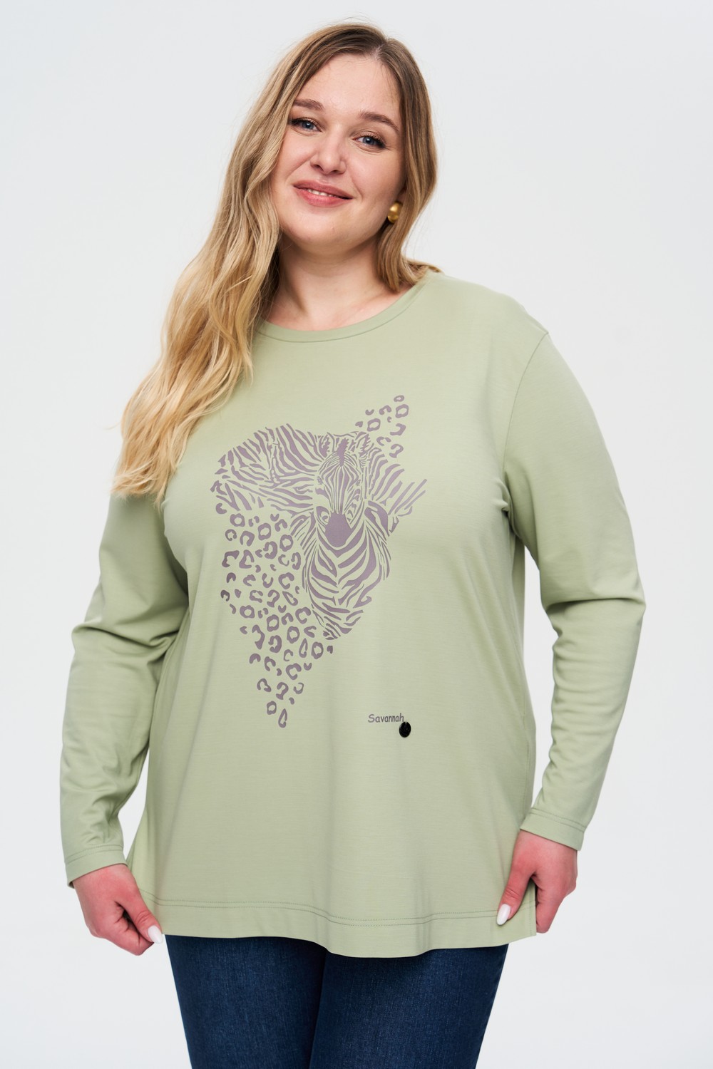 Женский фисташковый лонгслив большого размера с принтом из вискозы от бренда Интикома (Intikoma)