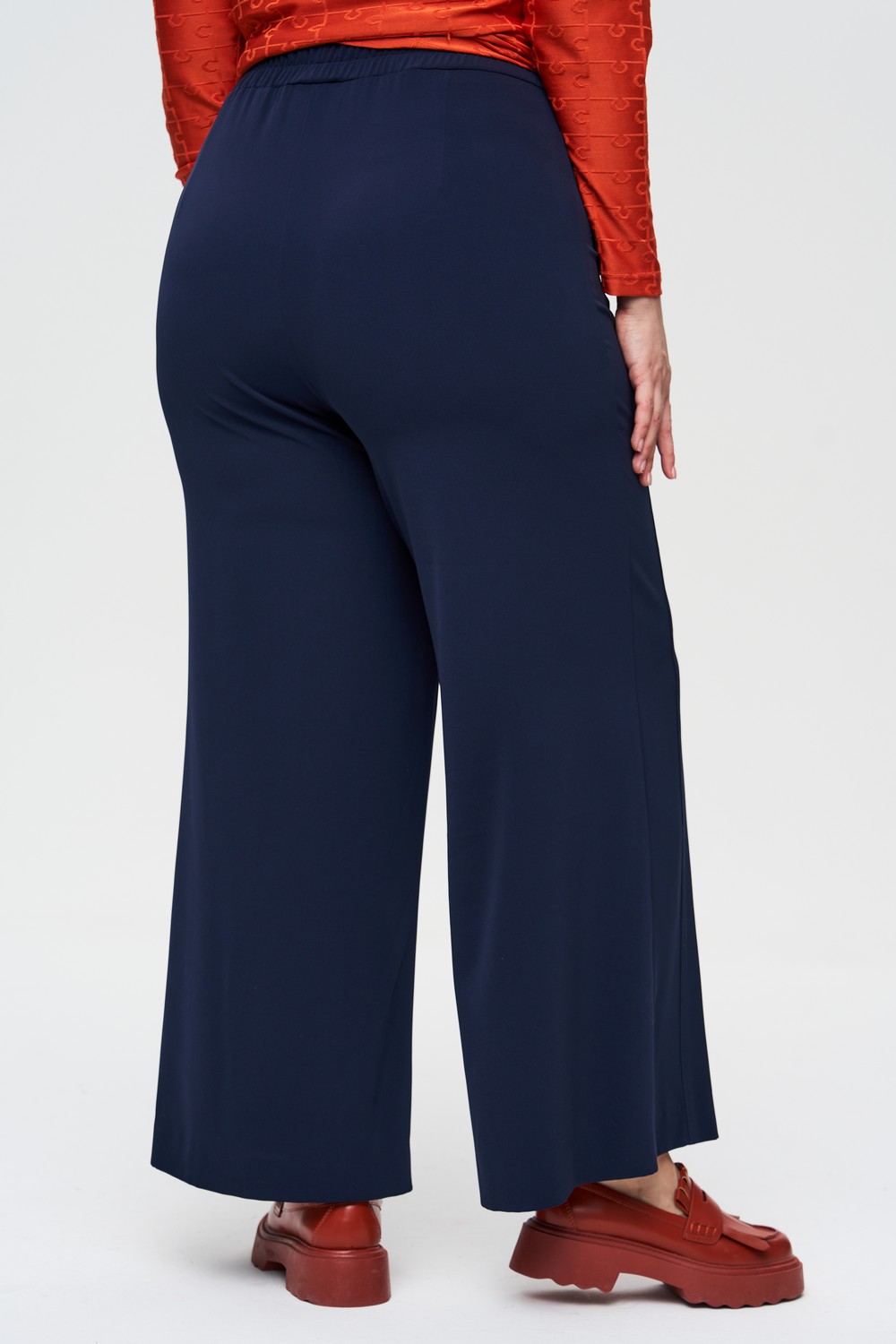 Женские темно-синие брюки-палаццо большого размера из легкой струящейся ткани от бренда Интикома (Intikoma). Детали: брюки палаццо, карманы по переду, пояс частично на резинке, без гульфика.