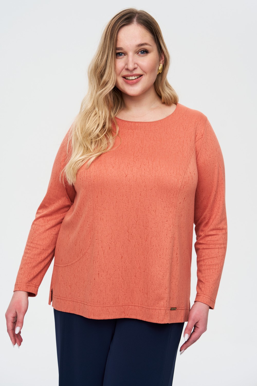 Описание: Женский базовый коралловый джемпер большого размера из смесовой ткани с меланжевым эыыектом от бренда Интикома (Intikoma). Детали: горловина округлая, длинный рукав, по бокам разрезы. Модель модная, стильная и актуальная, гармонично будет смотреться с джинсами, брюками и юбкой.