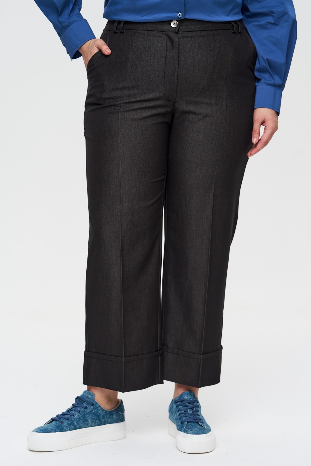 Женские темно-серые прямые брюки-кюлоты большого размера из поливискозы от бренда Интикома (Intikoma). Модель прямого кроя, с притачным поясом с резинкой и боковыми карманами, пояс на пуговице, застежка молния, по низу манжеты. Эластичная резинка в поясе
