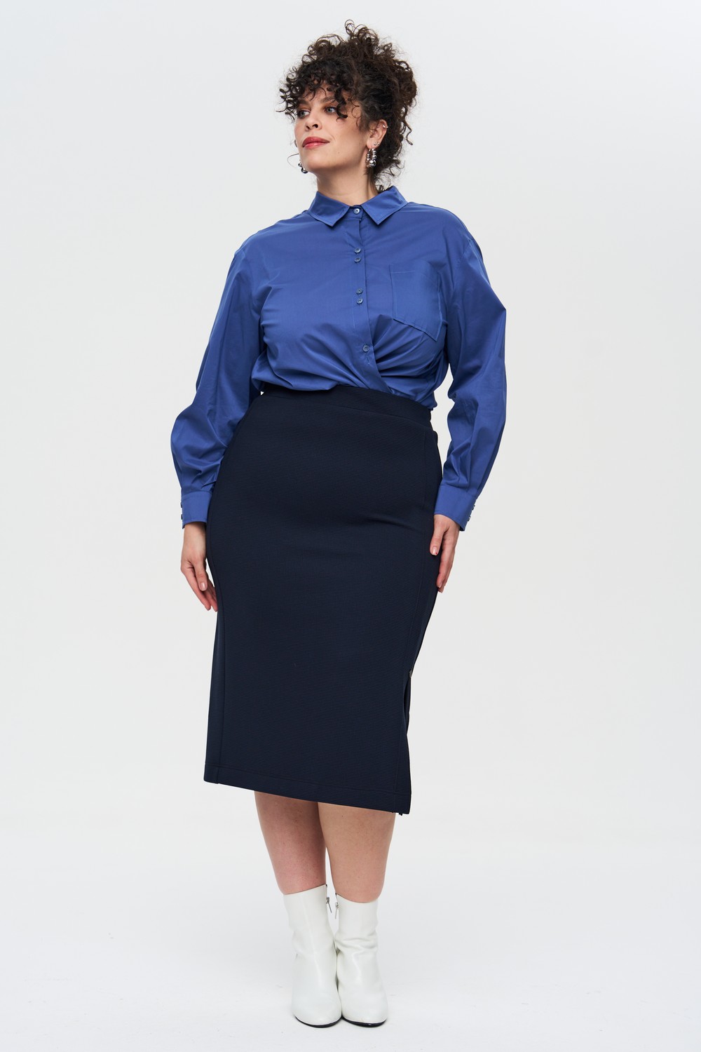 Описание: Женская синяя трикотажная юбка-карандаш большого размера длины миди из поливискозы от бренда Интикома (Intikoma)