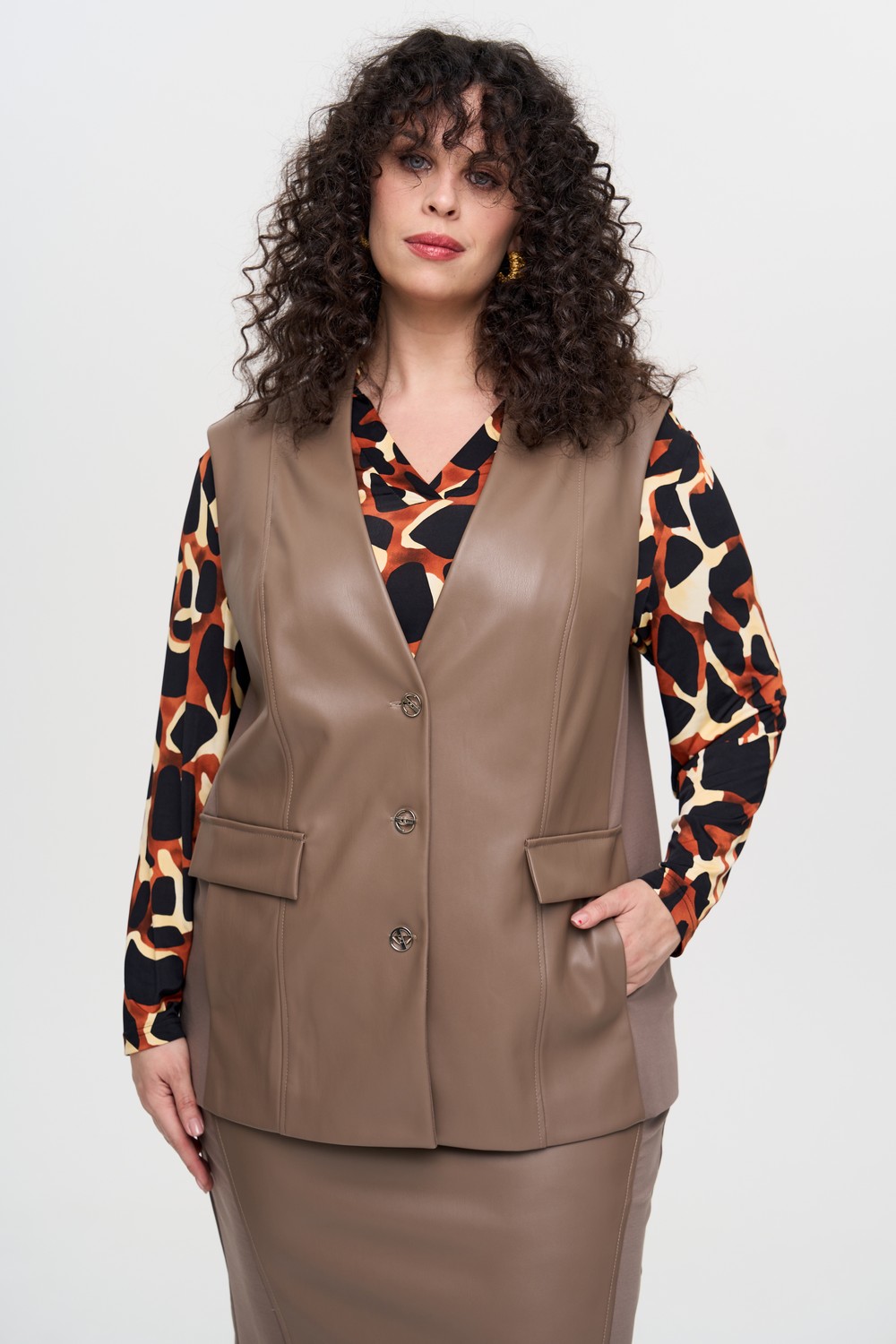 Описание: Женский бежевый жилет Сингер одеждабольшоих размеров бренд Интикома (Intikoma). Жилет из экокожи с трикотажными вставками. Жилет позволяет создавать множество креативных и стильных образов, идеальный выбор для современной женщины. Детали: полуприлегающий силуэт, центральная застежка на пуговицы, карманы в шве. В комплекте пояс из трикотажа. Стильный комплект можно составить с юбкой 624307