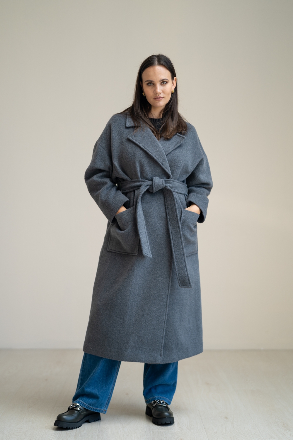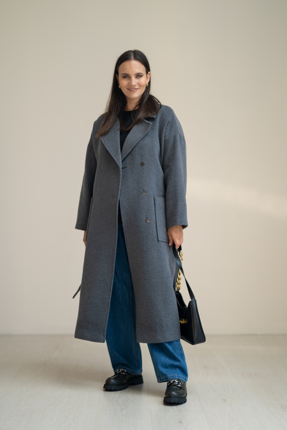 Женское серое драповое двубортное пальто большого размера от бренда Modress (Модресс). Пальто с эффектным английским воротником и съемным поясом. Рукава спущенные, прямые. Карманы накладные. Застегивается на пришивные кнопки. Ткань верха с содержанием шерсти, подкладка поливискоза.