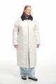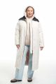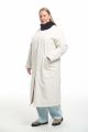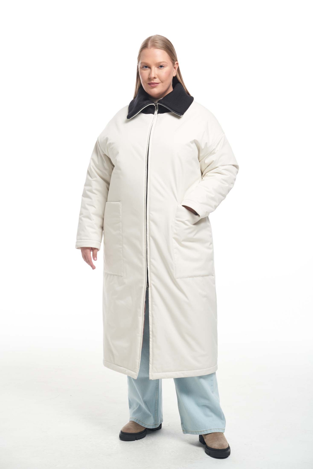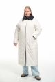 Женское демисезонное молочное пальто вободного кроя типа овер от бренда Modress (Модресс). Воротник –высокая трикотажная стойка. Плечевой пояс спущен, это обеспечивает отличную посадку на любую форму плеч. Боковые карманы накладные, большие. Есть съемный капюшон. Пальто застегивается на тракторную молнию «акулий зуб». Выполнено изделие из ткани с мембраной, которая усиливает влаго-и ветрозащитные свойства.
