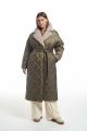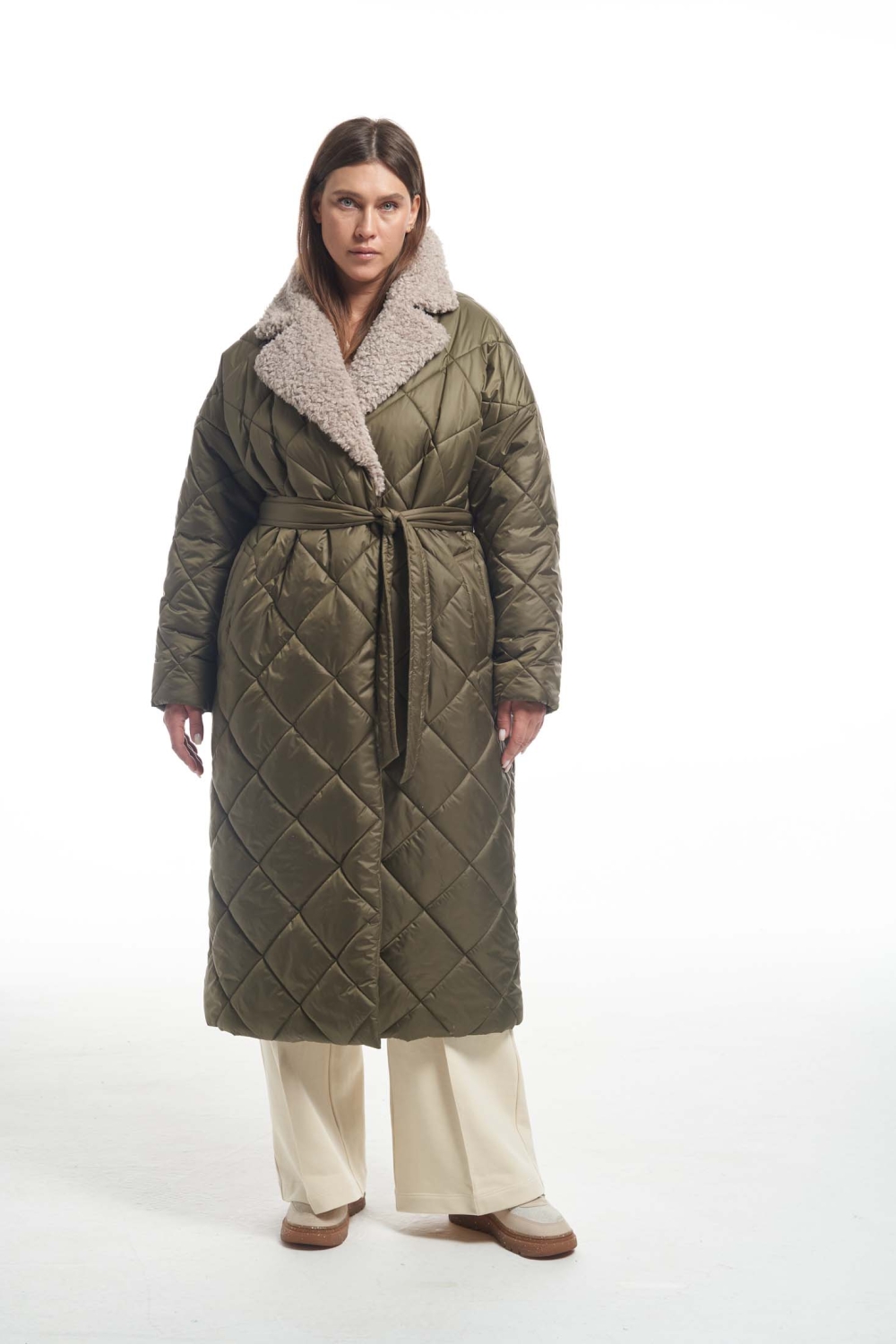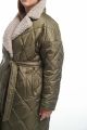 Женское демисезонное утепленное коричневое пальто-халат большого размера от бренда Modress (Модресс). Пальто прямого силуэта со съемным поясом. Воротник английский с лацканами, который, при желании, можно застегнуть до верха на дополнительную пуговицу. Воротник отделан искусственным мехом «овчинка». Плечевой пояс спущен, это обеспечивает отличную посадку на любую форму плеч. Боковые карманы прорезные с листочками. Застегивается пальто на потайные кнопки. Изделие выполнено из стеганой плащевой ткани с водоотталкивающими свойствами.