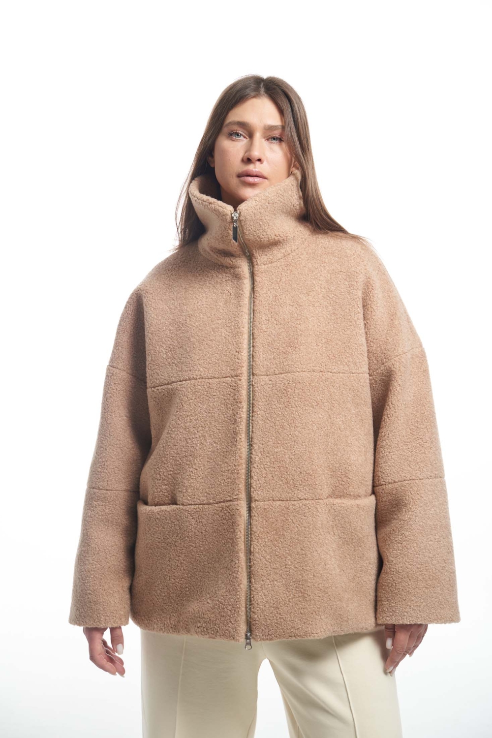 Женский демисезонный меховой бежевый бомбер большого размера от бренда Modress (Модресс). Бомбер прямого свободного кроя со спущенным плечевым поясом. Воротник –высокая стойка. Карманы выполнены в горизонтальных подрезах. Длина изделия чуть ниже линии бедер. Застегивается на металлическую молнию. Внизу изделия есть кулиска с регулируемой резинкой. Бомбер выполнен из искусственного меха «овчинка» с содержанием шерсти. На утепленном подкладе есть внутренний накладной карман.