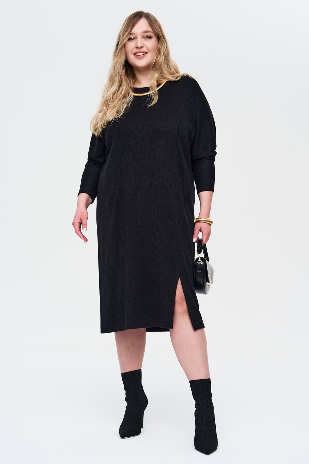 Женское черное трикотажное платье большого размера свободного кроя от бренда Интикома (Intikoma). Универсальное базовое платье, которое подойдет как для повседневных прогулок, так и для офисных встреч.Детали: прямой силуэт, цельнокроеный рукав, рельефы по платью обеспечивают идеальную посадку на разных типах фигуры. Разрез в рельефе по переду.