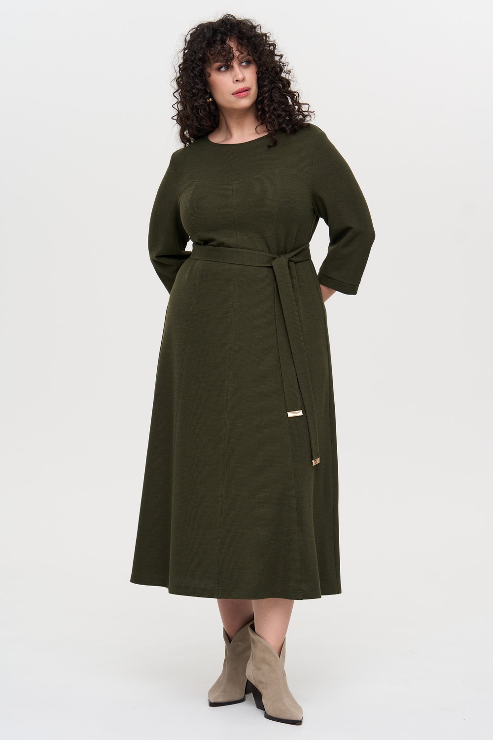 Женское фактурное трикотажное макси платье большого размерв в цвете хаки от бренда Интикома (Intikoma). Платье приятное к телу, комфортное, подойдёт как для работы в офисе, так и для повседневного гардероба. Детали: полуприлегающий силуэт с умеренно расклешённым низом, корсетный подрез, рельефы по спинке и переду, горловина округлая с планкой. Рукав, укороченный на манжете. В комплекте с поясом.
