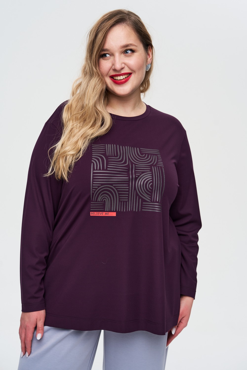 Описание: Женский фиолетовый с принтом лонгслив большого размера от бренда Интикома (Intikoma). Джемпер прямого силуэта с разрезами в боковом шве, смотрится сдержанно и элегантно. Детали: прямой силуэт, длинный рукав. Округлая горловина с планкой.