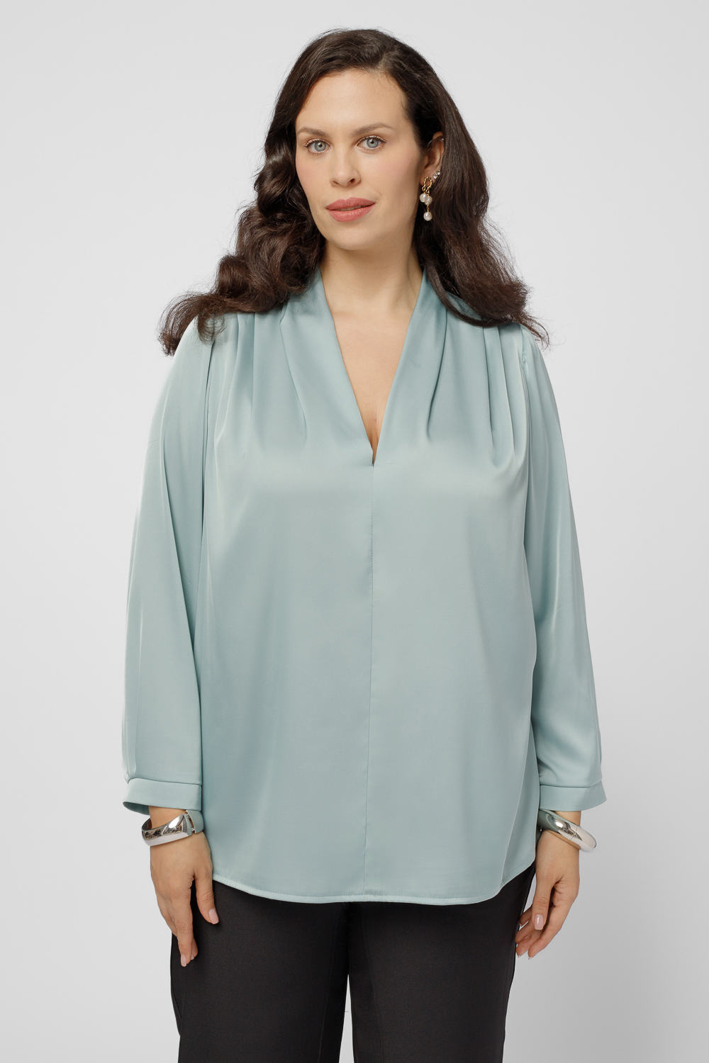 Женская нарядная мятная атласная блузка больших размеров от бренда Интикома (Intikoma). Стильный комплект можно составить с юбкой 725301