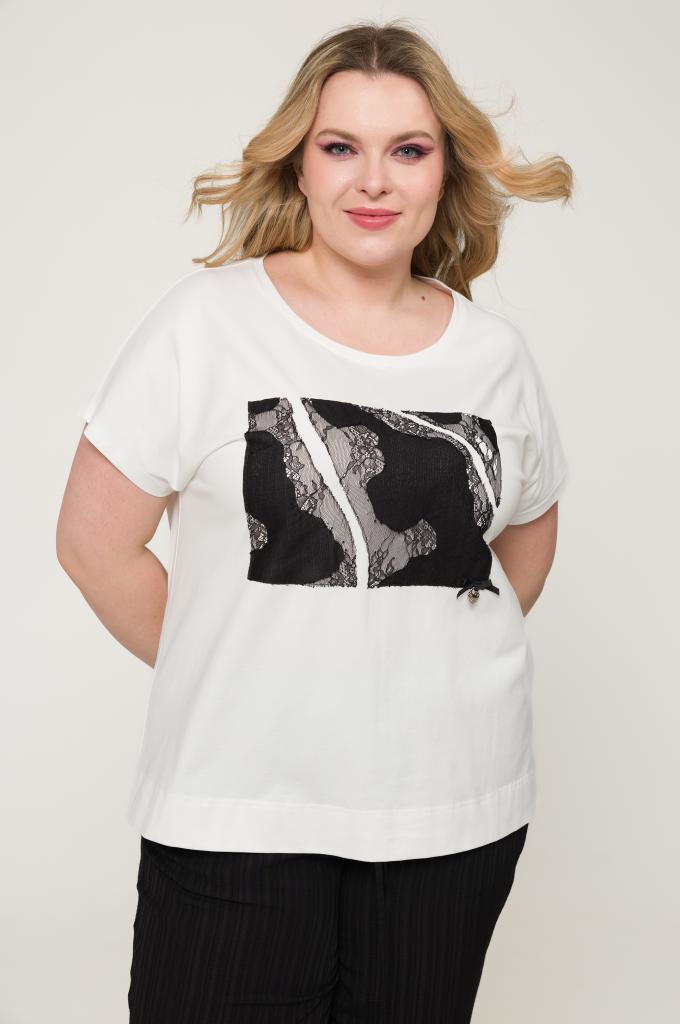 Описание: Женская белая блузка больших размеров от бренда Терра (Терра) из хлопка, декорирована принтом из кружева