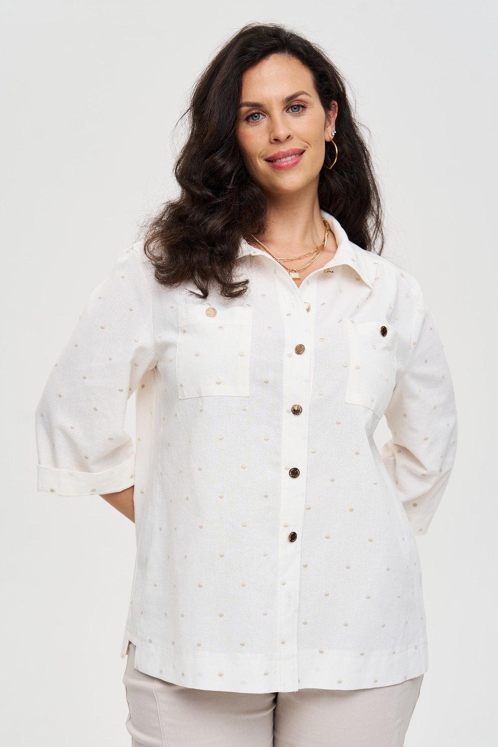 Описание: Женская белая в бежевый горох рубашка больших размеров из смесовой ткани от бренда Интикома (Intikoma)
