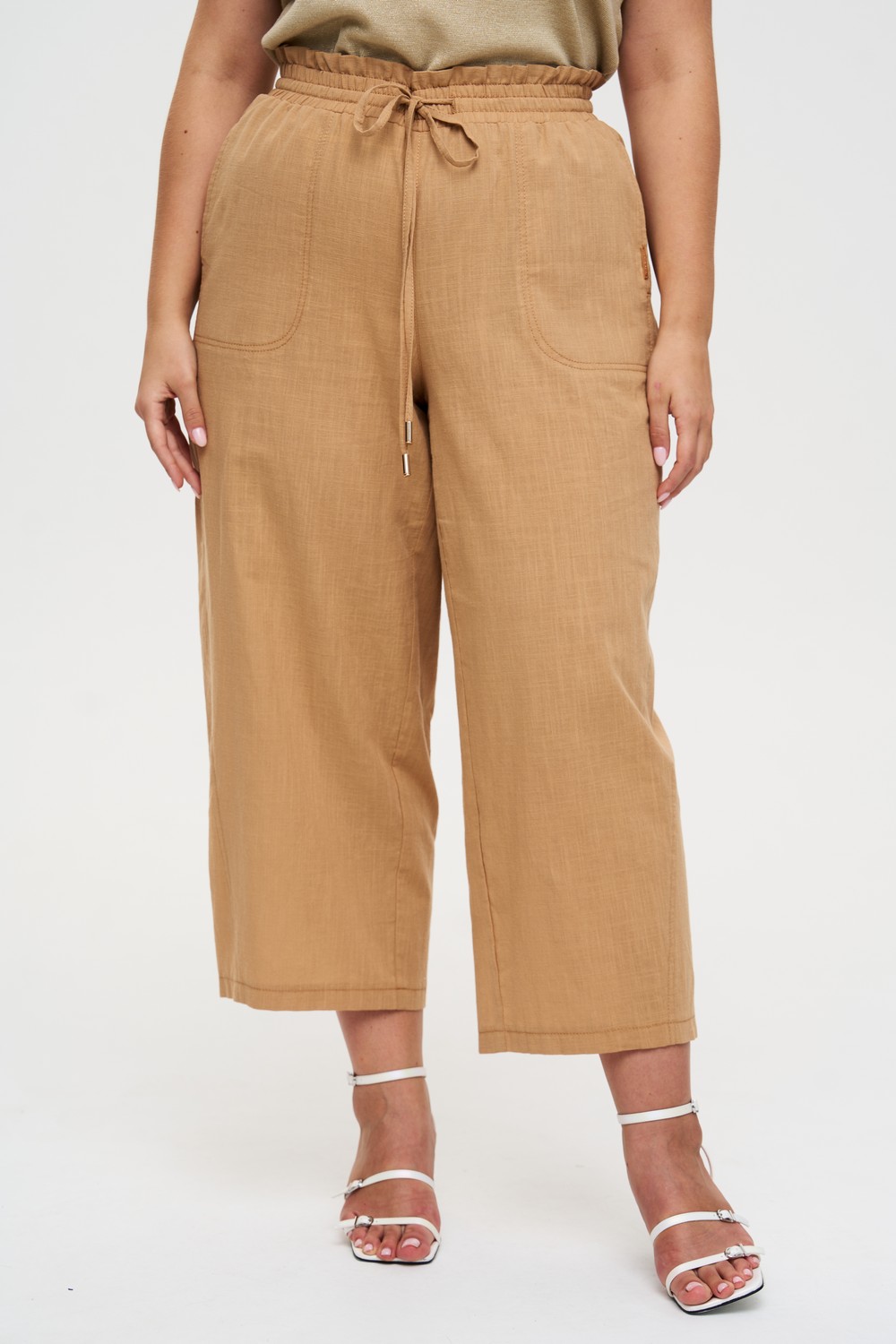 Женские бежевые укороченные брюки бананы больших размеров из хлопка от бренда Интикома (Intikoma). Детали: укороченная длина брюк, пояс на резинке с кулисой регулируется шнуром.