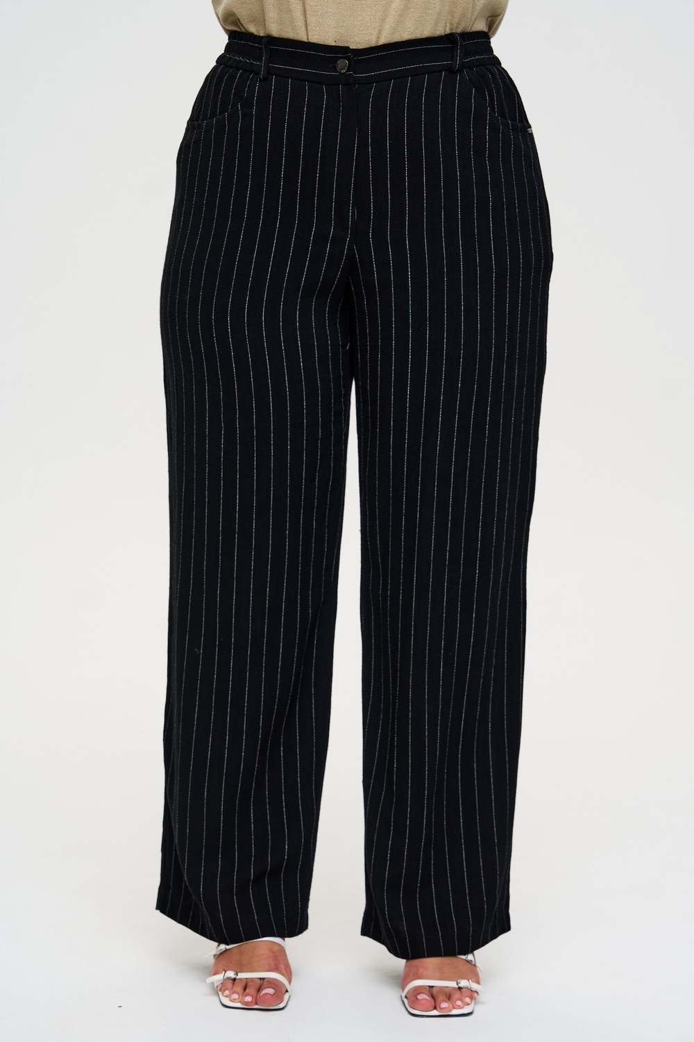 Женские широкие черные в полоску брюки больших размеров от бренда Интикома (Intikoma). Брюки выполнены из хлопка и льна