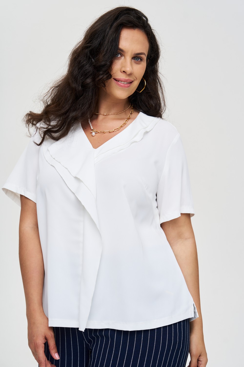 Женская шелковая молочная блузка больших размеров с жабо от бренда Интикома (Intikoma).