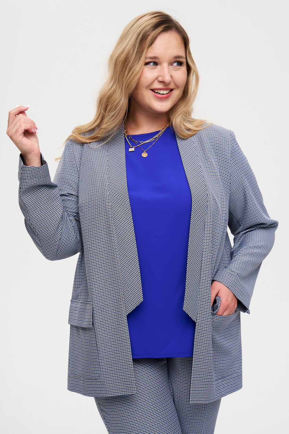 Женский синий в мелкую клетку жакет больших размеров из смесовой ткани от бренда Интикома (Intikoma). Жакет свободного кроя. Стильный комплект можно составить с брюками 725035, а также можно сочетать как самостоятельных элемент с джинсами и другими брюками или патьями