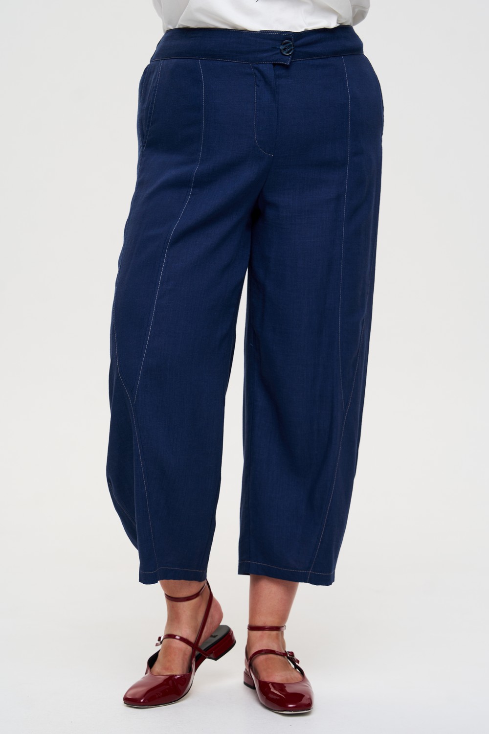Женские синие брюки бананы больших размеров из хлопка и льна от бренда Интикома (Intikoma). Брюки свободного кроя. Стильный комплект можно собрать с акетом 525027