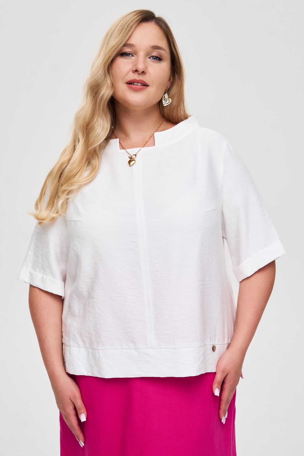 Описание: Женская белая блузка больших размеров из вискозы от бренда Интикома (Intikoma). Блузка свободного кроя с необычным вырезом. Правильная длина, которая отлично сочетается с брюками и юбками