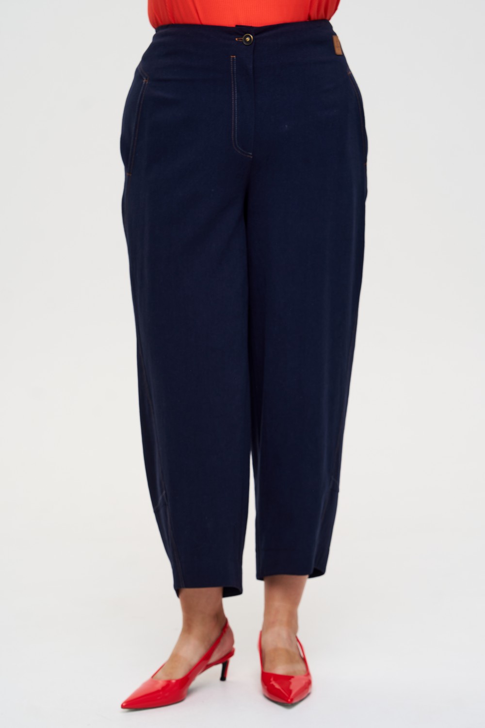 Женские темно-синие свободные бркюи больших размеров из смесовой ткани от бренда Интикома (Intikoma). Брюки выполнены в стиле бохо, для расслабленного образа