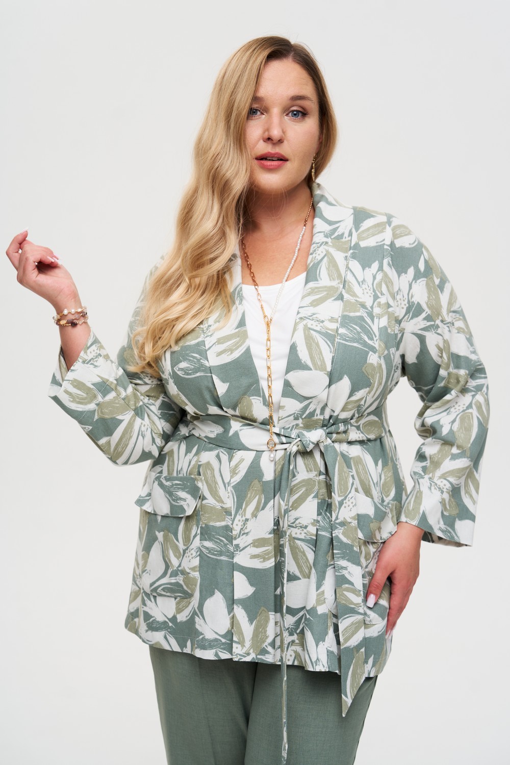 Женский зеленый с цветочным принтом кардиган-жакет больших размеров из хлопка и льна от бренда Интикома (Intikoma). Жакет с поясом,немного напоминает стиль кимоно