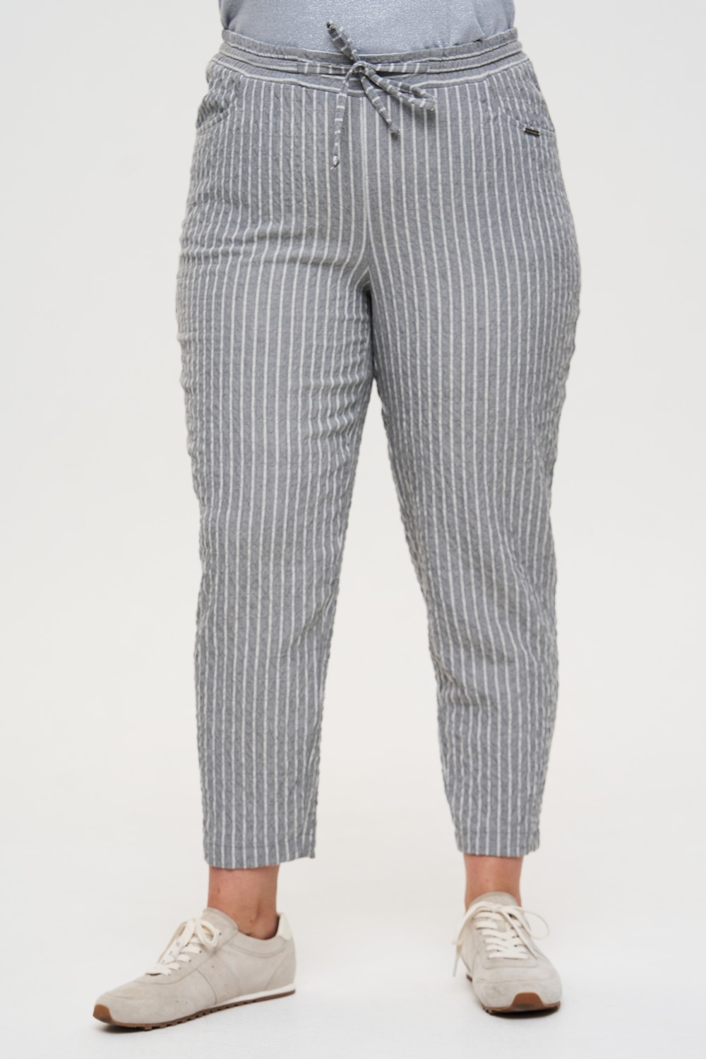 Женские серые в полоску зауженные брюки больших размеров из смесовой ткани от бренда Интикома (Intikoma). Стильный образ можно собрать с жакетом 525045