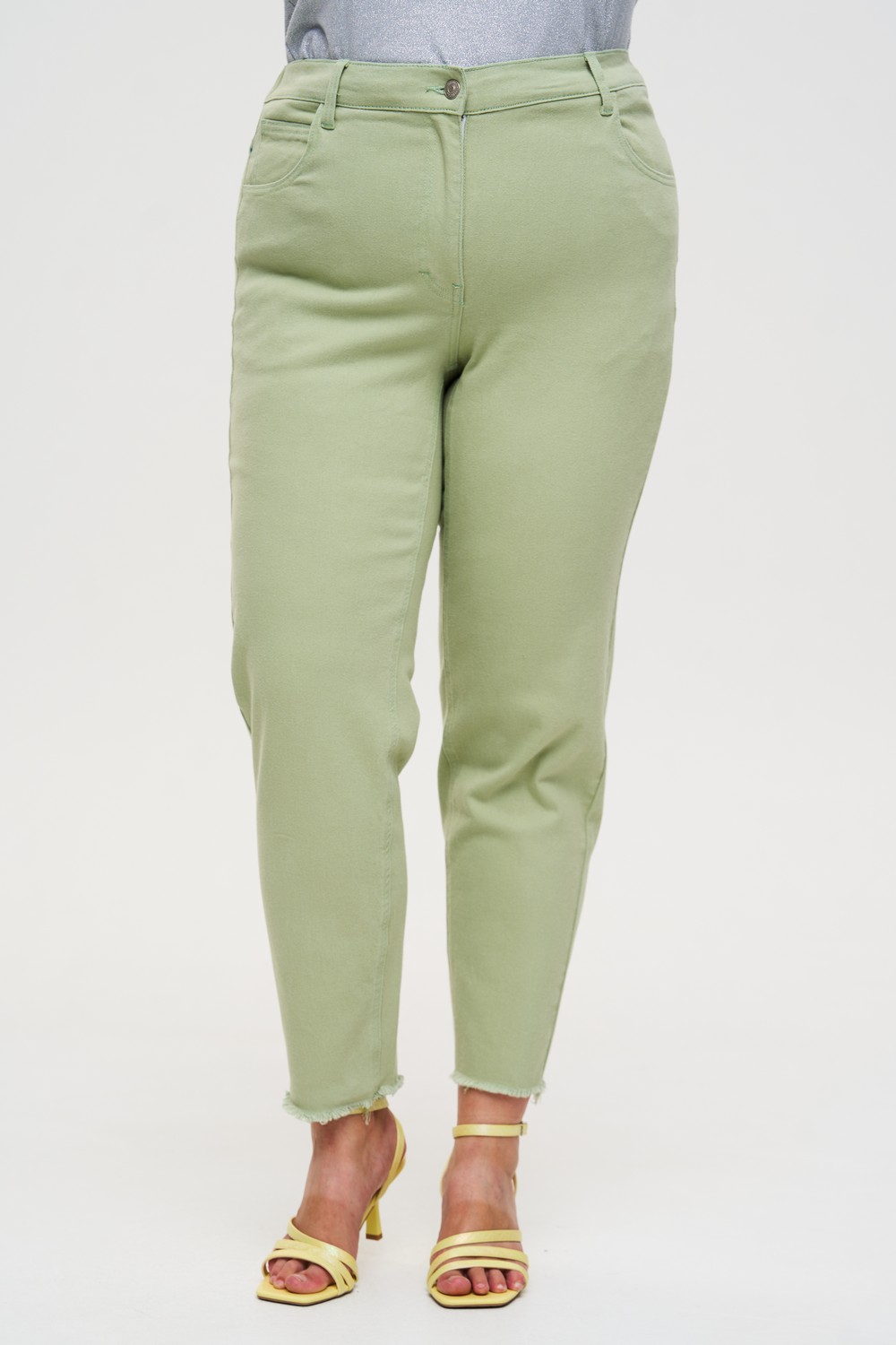 Женские фисташковые зауженные книзу джинсы больших размеров из хлопка от бренда Интикома (Intikoma). По низу джинсы имеют обрезной край