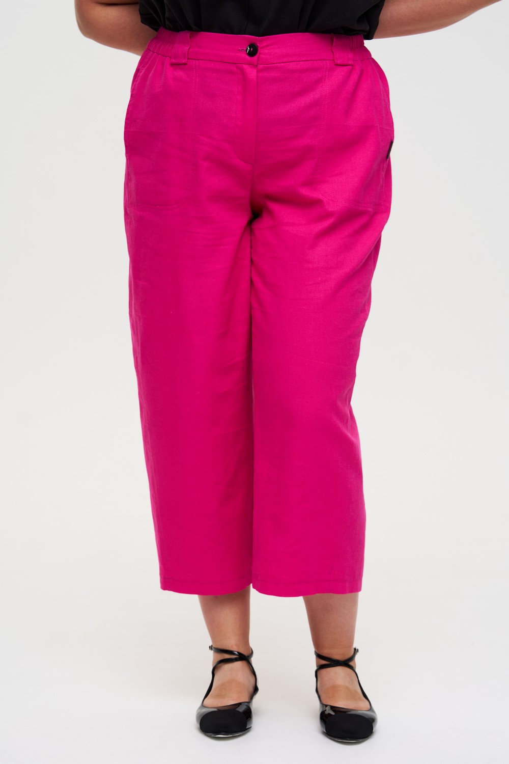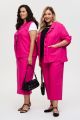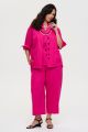Женские брюки-бананы больших размеров в цвете фуксия из хлопка от бренда Интикома (Intikoma). Детали: пояс частично на резинке, застежка центральная на молнию в гульфике, пояс на пуговице, шлевки на поясе. Стильные комплекты можно составить с жилетом 525023 и жакетом 525021