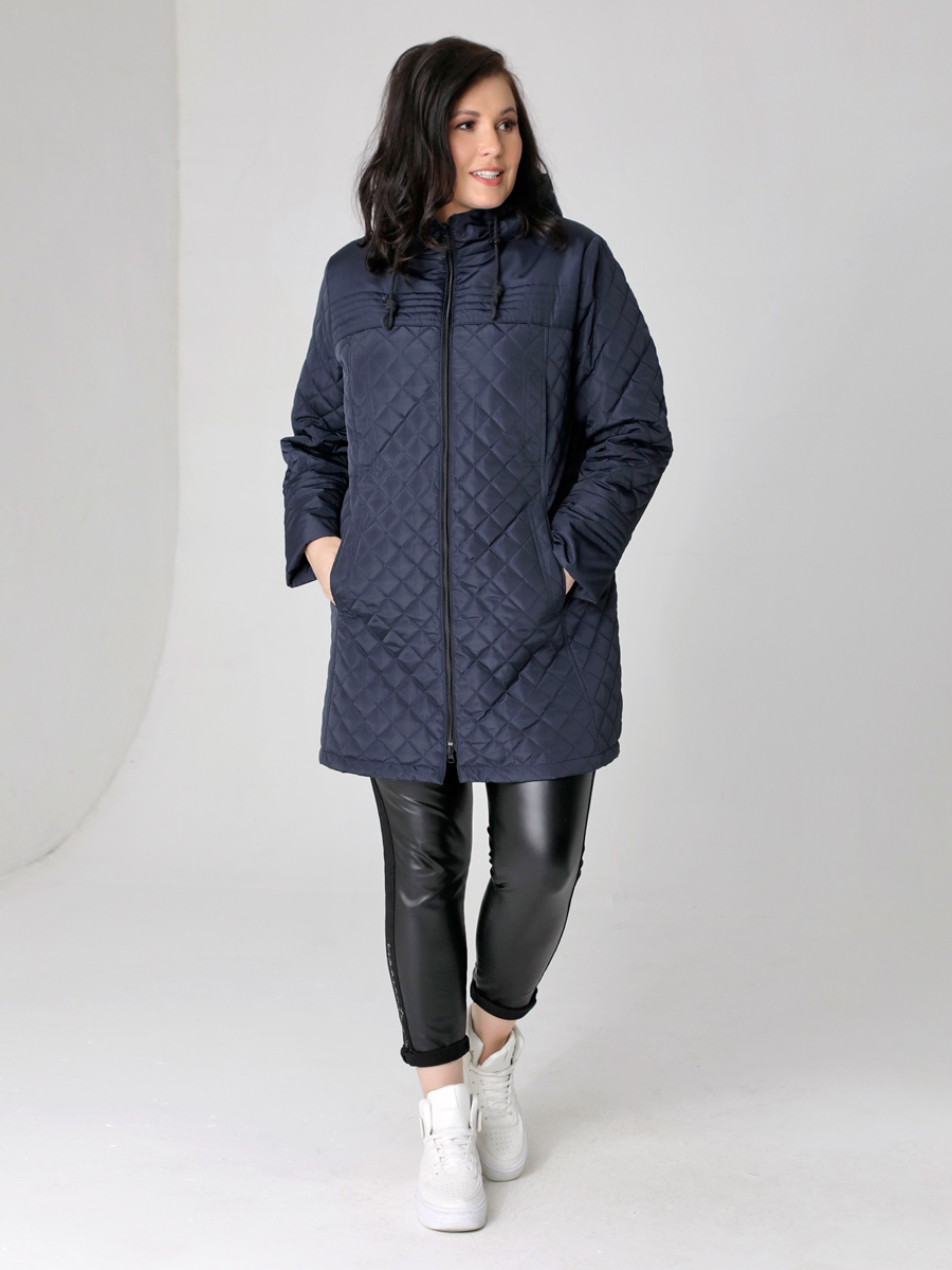 Женская синяя демисезонная стеганая куртка больших размеров от бренда Модресс (Modress). Куртка прямого силуэта, длиной до бедер. Воротник отложной с закругленными углами. Плечевой пояс немного спущен. Боковые карманы прорезные с листочками. Застегивается куртка на петли и пуговицы.