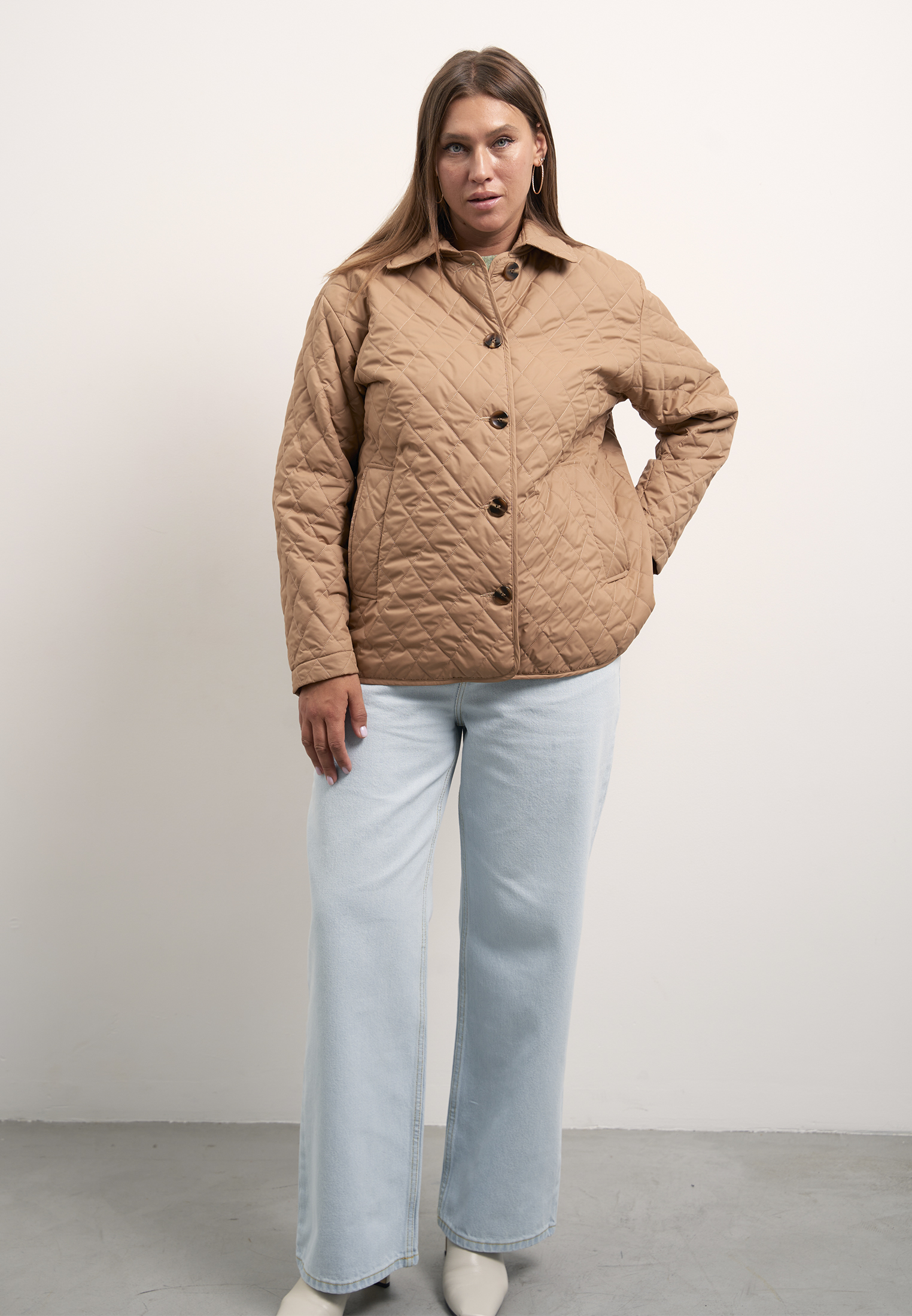 Женская бежевая демисезонная стеганая куртка больших размеров от бренда Модресс (Modress). Куртка прямого силуэта, длиной до бедер. Воротник отложной с закругленными углами. Плечевой пояс немного спущен. Боковые карманы прорезные с листочками. Застегивается куртка на петли и пуговицы.