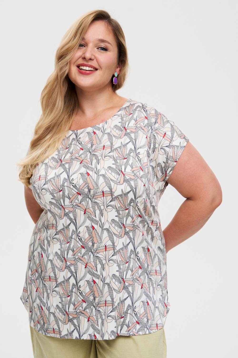 Описание: Женский бежевый с принтом стрекозы топ больших размеров из вискозы от бренда Интикома (Intikoma)