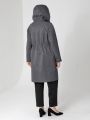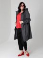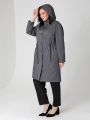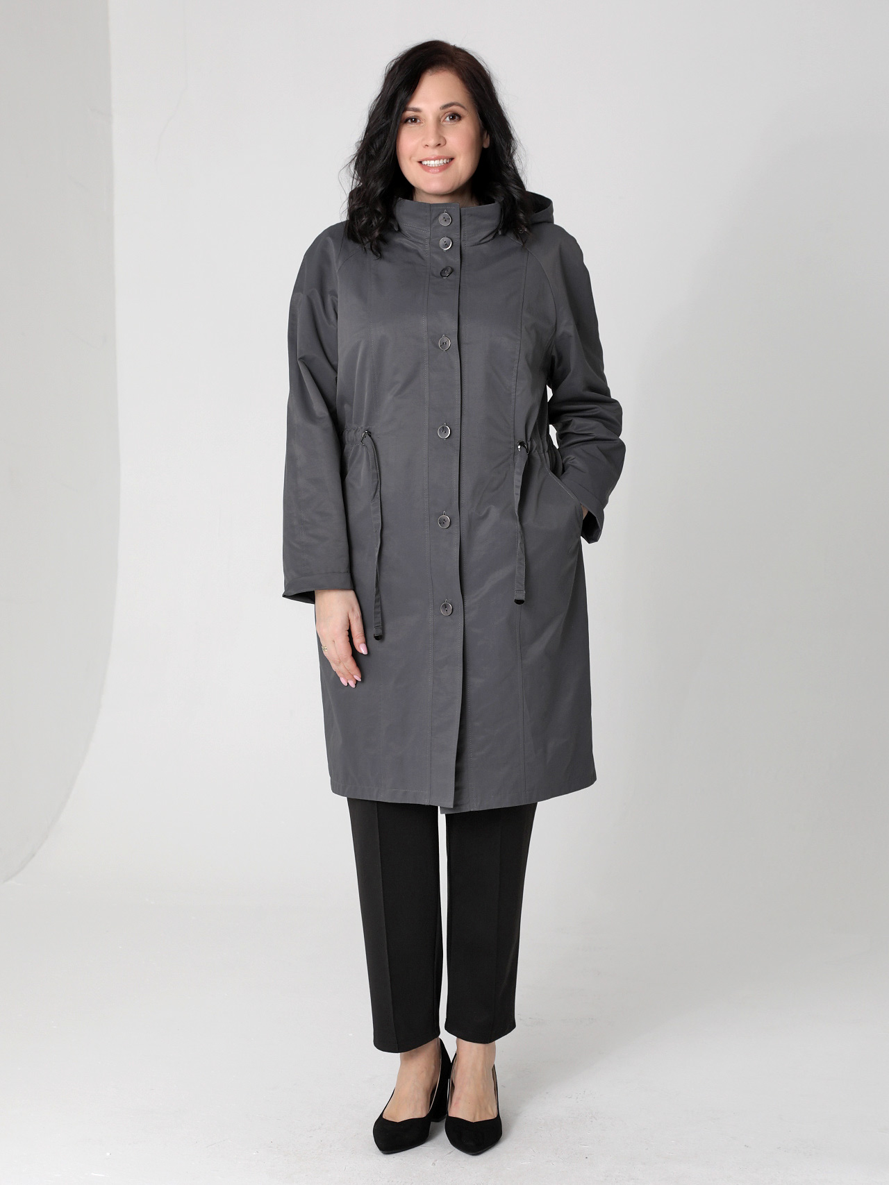 Женский графитовый весенний плащ больших размеров средней длины прямого силуэта от бренда Dizzy Way (Диззи вэй). Рукав - покроя реглан, застежка на петли и пуговицы. Воротник - стойка с отстегивающимся капюшоном. Есть внутренний кармашек на молнии. Силуэт плаща можно менять с помощью затяжки по линии талии. плащ из хлопкосодержащей ткани с водоотталкивающей пропиткой хорошо садится на любую фигуру.
