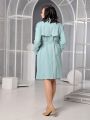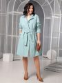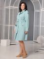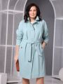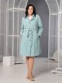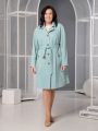 Женский ментоловый плащ-тренч больших размеров средней длины прямого силуэта с поясом от бренда Dizzy way (Диззи вэй). Застежка на петли и пуговицы, воротник, отлетная кокетка, погоны на рукавах-реглан и шлица на спинке. Хлопковая плащевая ткань имеет водоотталкивающую пропитку. Подкладка из поливискозы