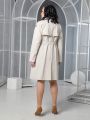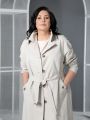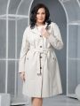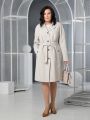 Женский бежевый плащ-тренч больших размеров средней длины прямого силуэта с поясом от бренда Dizzy way (Диззи вэй). Застежка на петли и пуговицы, воротник, отлетная кокетка, погоны на рукавах-реглан и шлица на спинке. Хлопковая плащевая ткань имеет водоотталкивающую пропитку. Подкладка из поливискозы