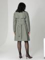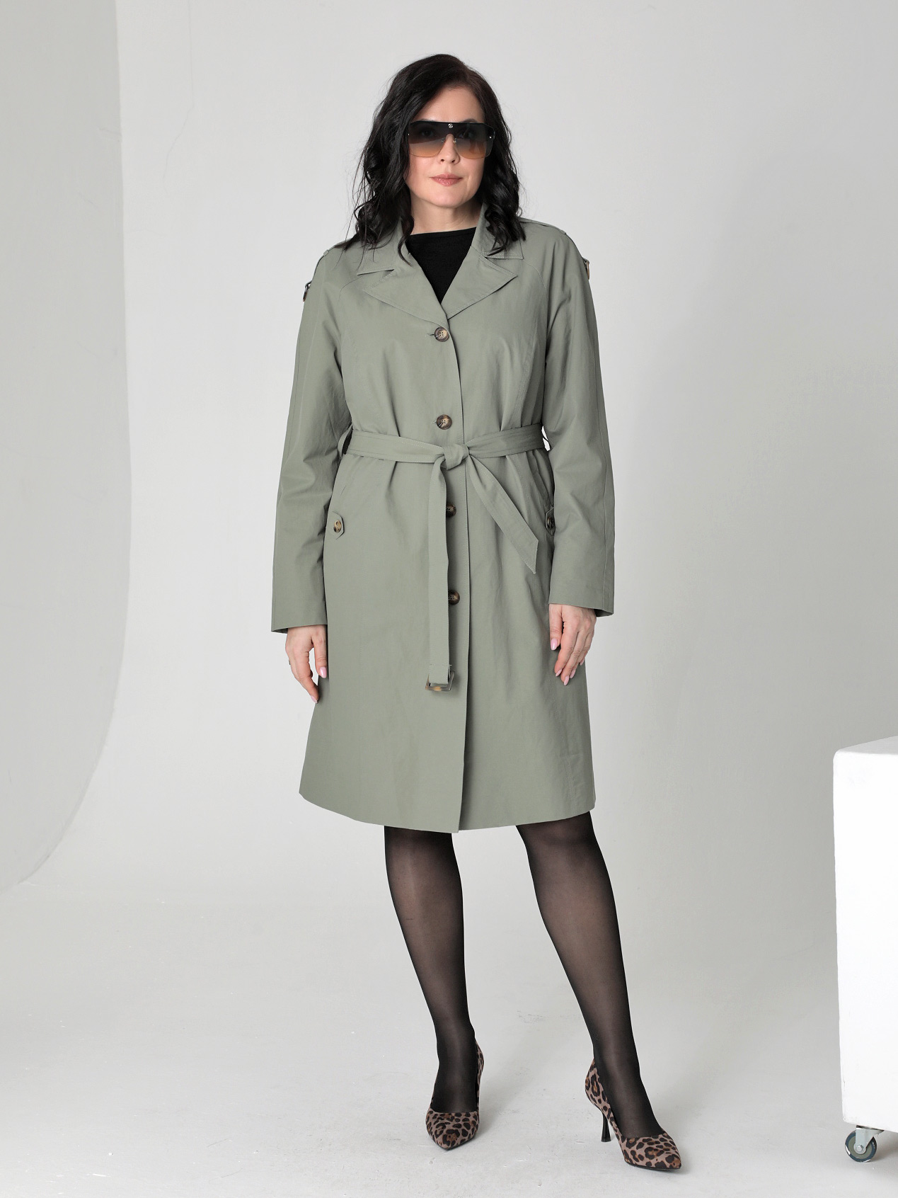 Женский плащ-тренч больших размеров в цвете хаки средней длины прямого силуэта с поясом от бренда Dizzy way (Диззи вэй). Застежка на петли и пуговицы, воротник, отлетная кокетка, погоны на рукавах-реглан и шлица на спинке. Хлопковая плащевая ткань имеет водоотталкивающую пропитку. Подкладка из поливискозы