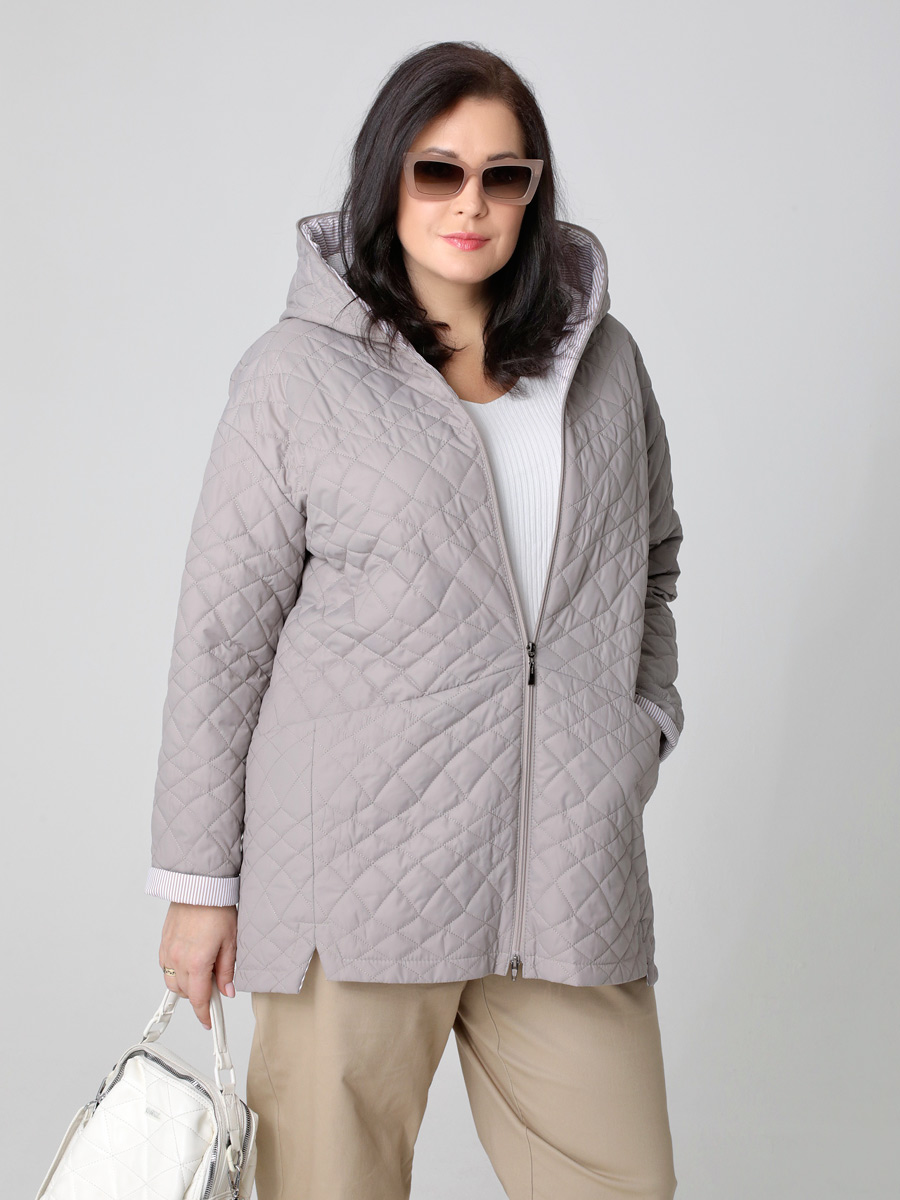 Женская бежевая весенняя куртка большого размера прямого силуэта с капюшоном от бренда Dizzy Way (Диззи вэй). Застежка - на двухзамковую молнию, что позволяет легко расстегнуть ее как сверху, так и снизу. Стеганая плащевая ткань имеет водоотталкивающую пропитку.