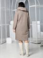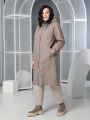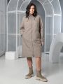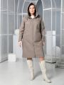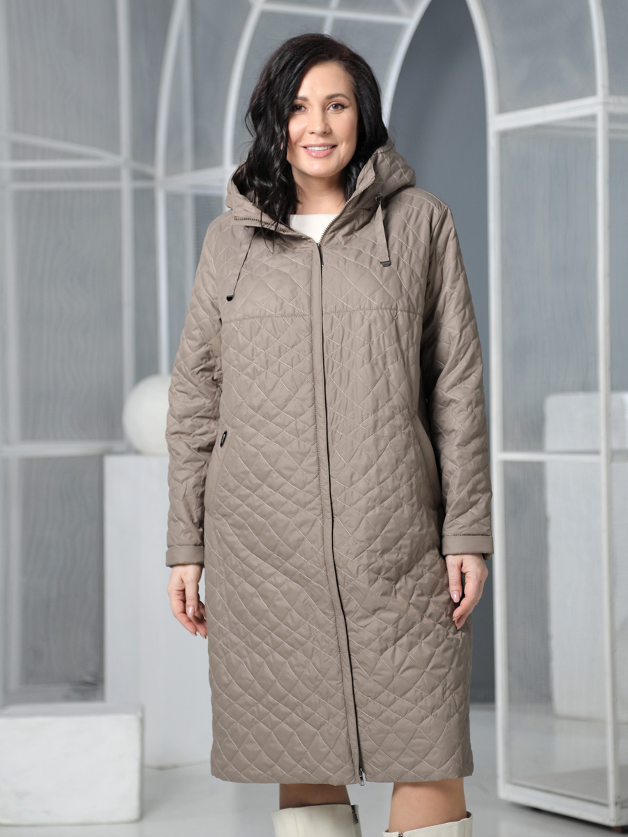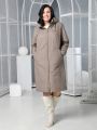 Женский темно-бежевый утепленный плащ больших размеров прямого силуэта с втачными рукавами от бренда Dizzy way (Диззи вэй). Застежка - на двухзамковую молнию, что позволяет легко расстегнуть ее как сверху, так и снизу. Воротник - стойка, переходящая в капюшон. Плащевая ткань имеет водоотталкивающую пропитку
