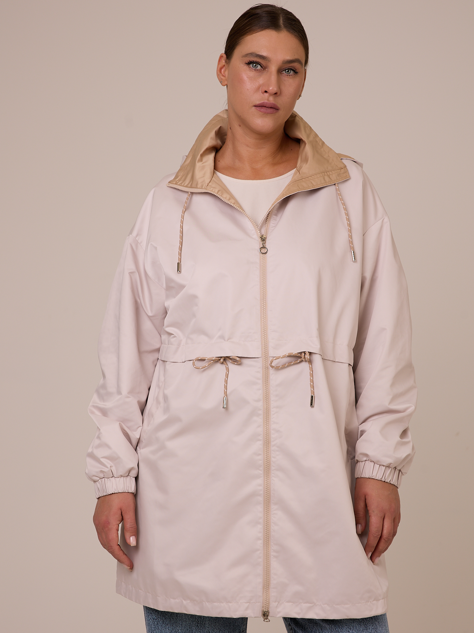 Женская молочная демисезонная парка больших размеров от бренда Модресс (Modress). Парка прямого свободного кроя с кулиской на талии. Воротник- стойка. Есть съемный капюшон. Рукава спущенные с манжетами на резинке. Боковые карманы на молнии. По низу изделия выполнена кулиска с регулируемой резинкой. Парка застегивается на молнию. Выполнена из плотной курточной ткани с водоотталкивающими свойствами