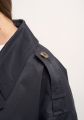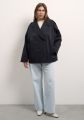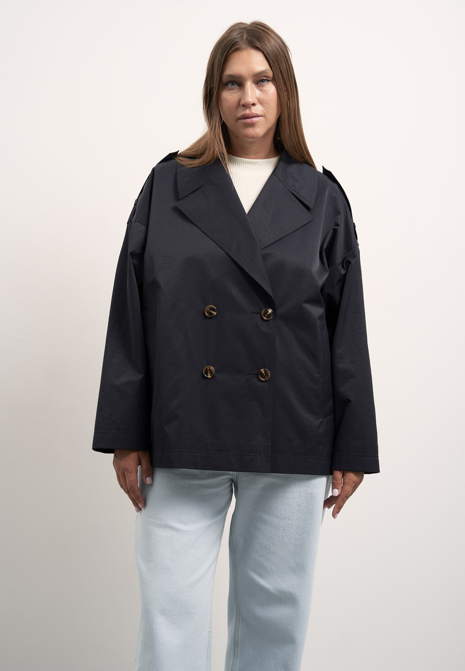 Женский черный двубортный укороченный тренч больших размеров прямого свободного кроя от бренда Модресс (Modress). Воротник широкий английский с лацканами. Рукава спущенные с погонами - элемент тренча. Боковые карманы прорезные с листочками. Длина изделия до линии бедер. Застегивается изделие на пуговицы. Жакет выполнен из плащевой ткани с содержанием хлопка.