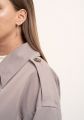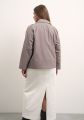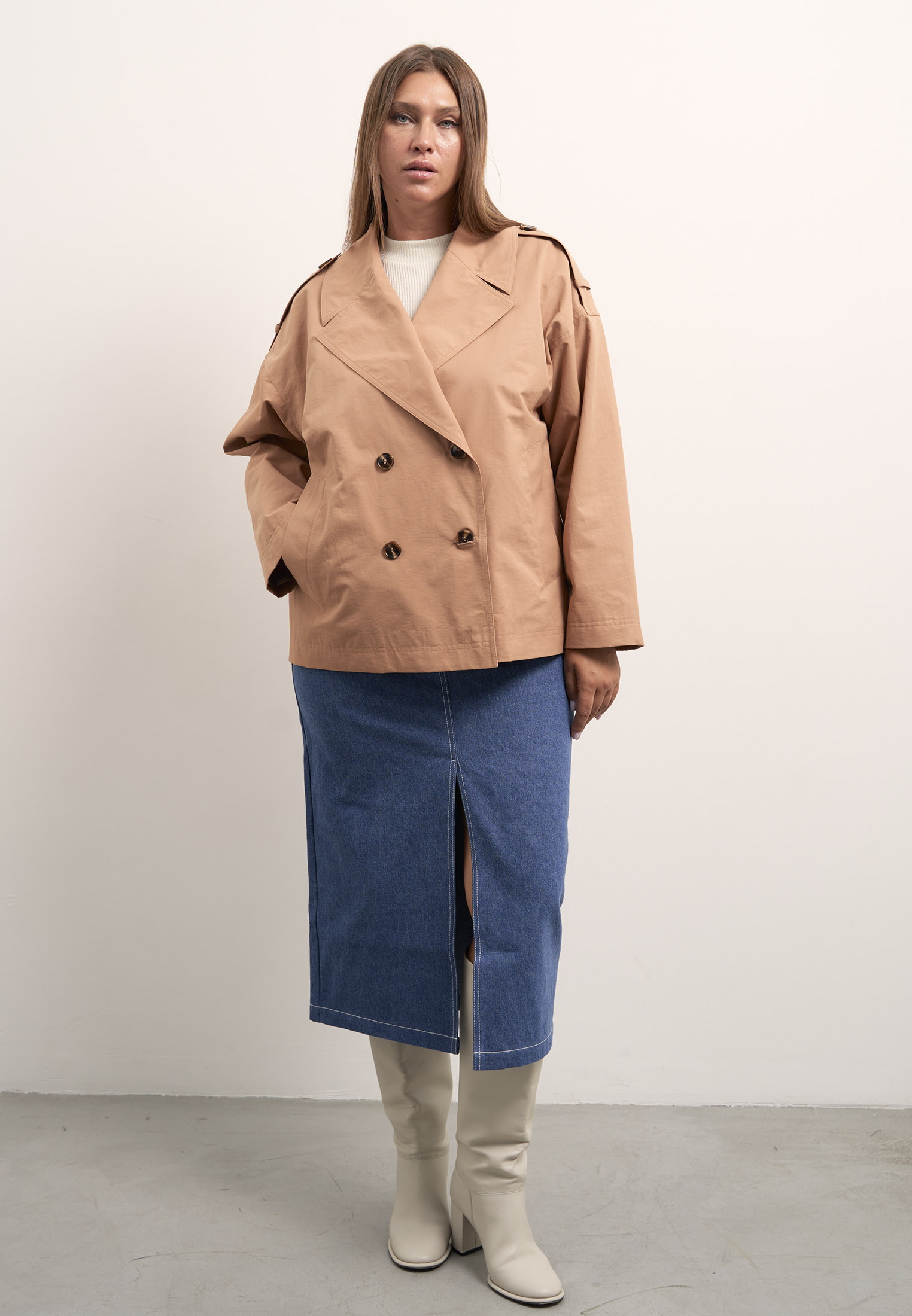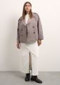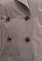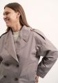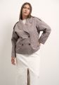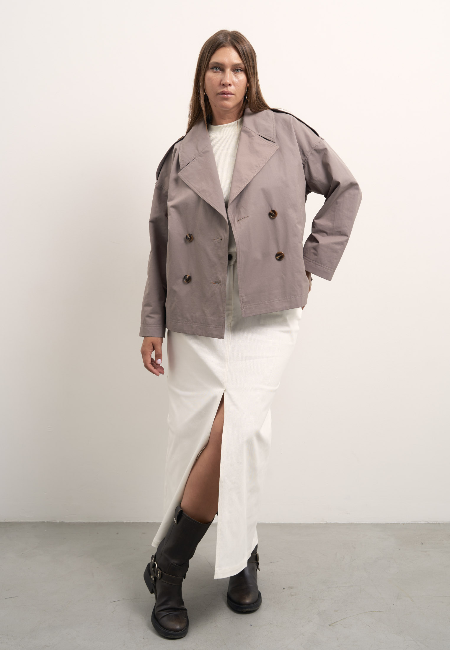 Женский серый двубортный укороченный тренч больших размеров прямого свободного кроя от бренда Модресс (Modress). Воротник широкий английский с лацканами. Рукава спущенные с погонами - элемент тренча. Боковые карманы прорезные с листочками. Длина изделия до линии бедер. Застегивается изделие на пуговицы. Жакет выполнен из плащевой ткани с содержанием хлопка.