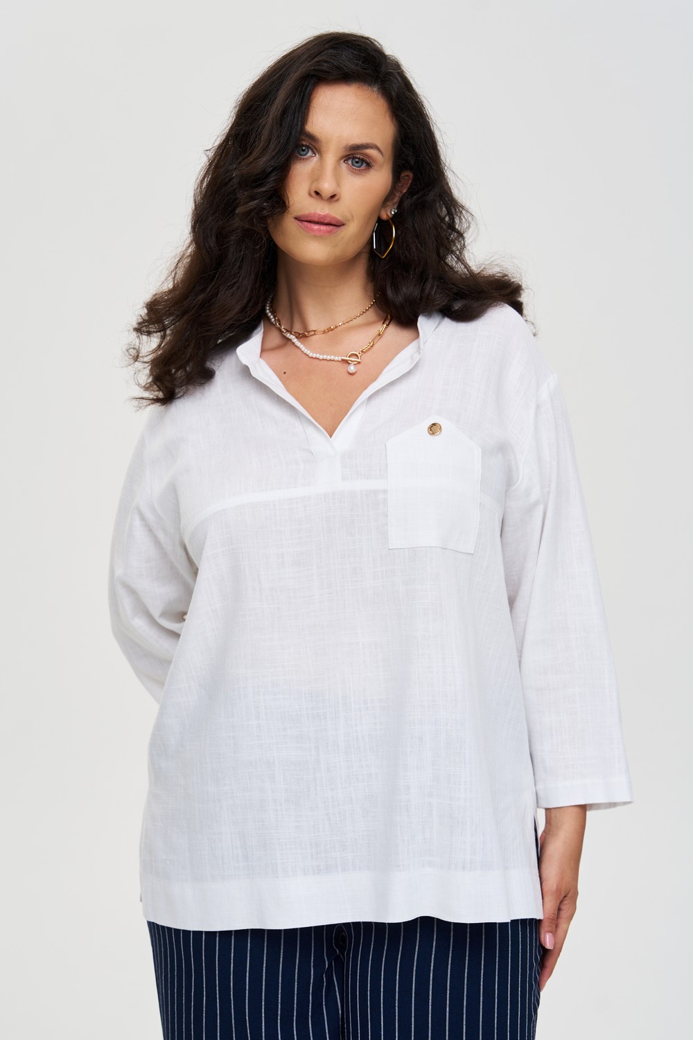 Женская белая свободная летняя блузка больших размеров из льна и хлопка от бренда Интикома (Intikoma)