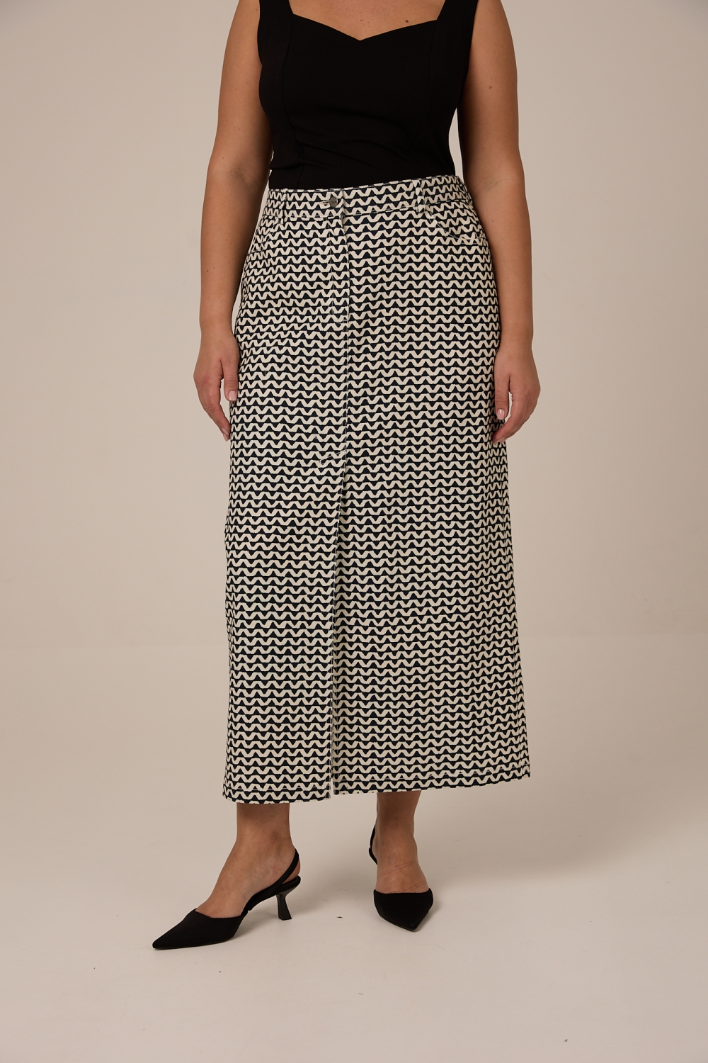 Женская молочная с синим принтом джинсовая макси юбка-карандаш большого размера от бренда Modress (Модресс). Пояс частично на резинке, есть шлевки. Сильный образ можно собрать с топом ANGELICA