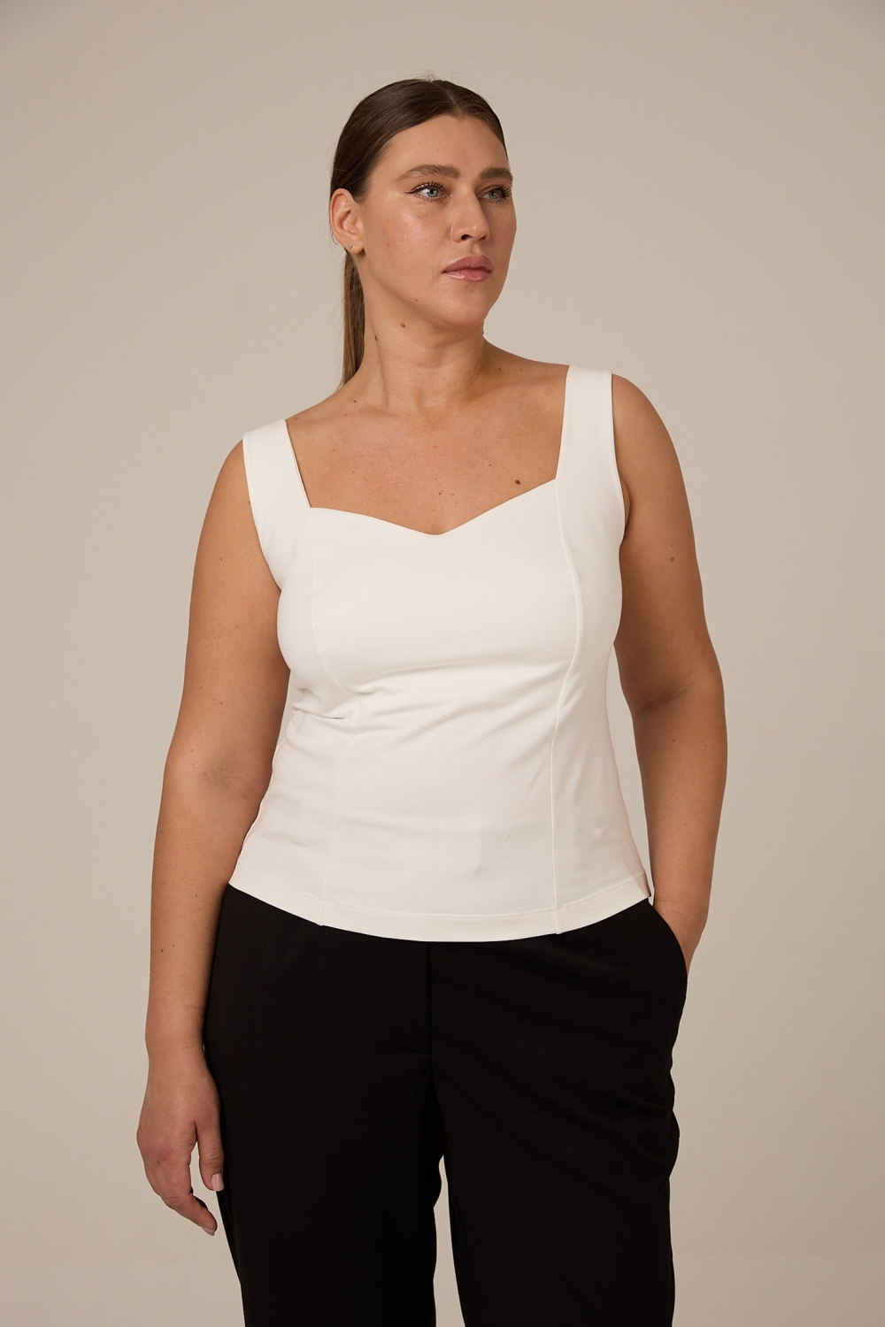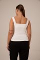 Описание: Женский молочный облегающий, приталенный топ больших размеров от бренда Modress (Модресс). Топ с фигурным вырезом на широких лямках, из хлопкового трикотажа в двух цветах черном и молочном.