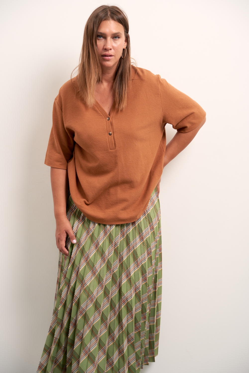 Описание: Женская коричневая хлопковая блузка большого размера в стиле поло от бренда Modress (Модресс). Блузон свободного кроя со спущенным плечом.