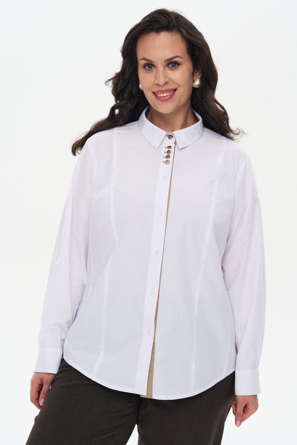 Рубашка АНДРИЯ белая Интикома - одежда больших размеров. Женская белая рубашка большого размера Интикома из хлопка с застежкой, отложным воротником на контрастной отрезной стойке и втачным длинным рукавом. Модель подходит как для повседневных выходов, так и для более формальных мероприятий, добавляя в образ нотки элегантности и стиля.