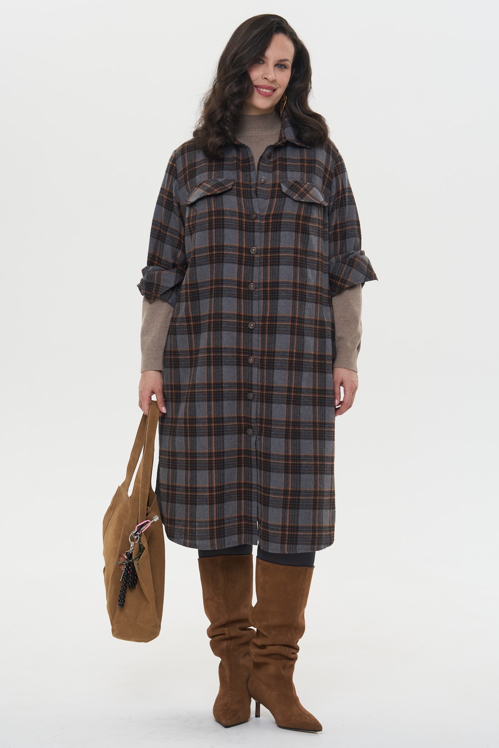 Женское платье-рубашка ТАРТУФО коричневое в клетку Интикома - одежда больших размеровдля женщин. Платье выполнено из легкой костюмной ткани, которая почти не мнется. Платье можно носить и как самостоятельную модель, и как удлиненную рубашку на брюки или джинсы. Идеально подойдет в качестве основы для создания многослойных образов