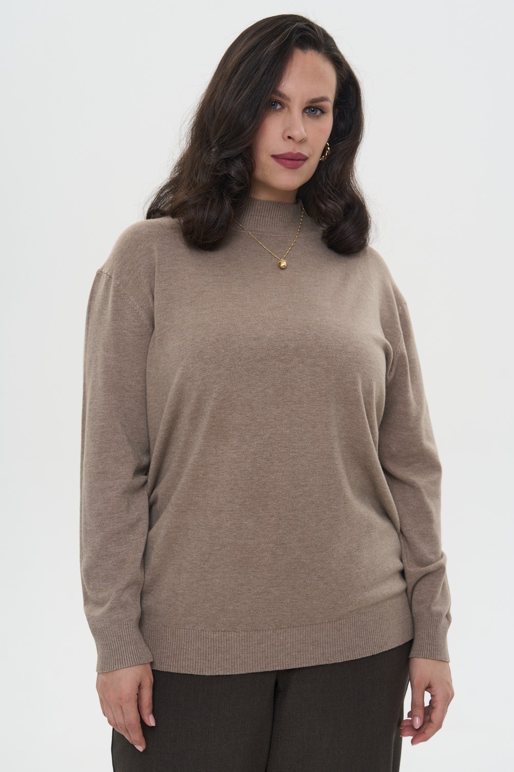 Женский бежевый джемпер ВОДОЛЕЙ Интикома (Intikoma). Женский бежевый джемпер-водолазка большого размера от бренда Интикома комфортного облегания с горлом, средним по высоте воротником-стойкой и втачным длинным рукавом.