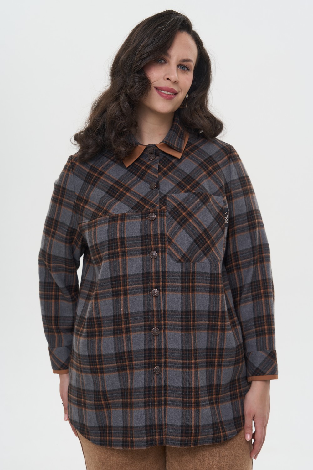 Женская коричневая в клетку рубашка ТАРТАН Интикома (Intikoma) - одежда для полных женщин. Рубашка прямого кроя, выполнена из смесового хлопкого полотка и почта не мнется. У рубашки необычный двойной воротник. Центральная застёжка на металлические пуговицы-болты.